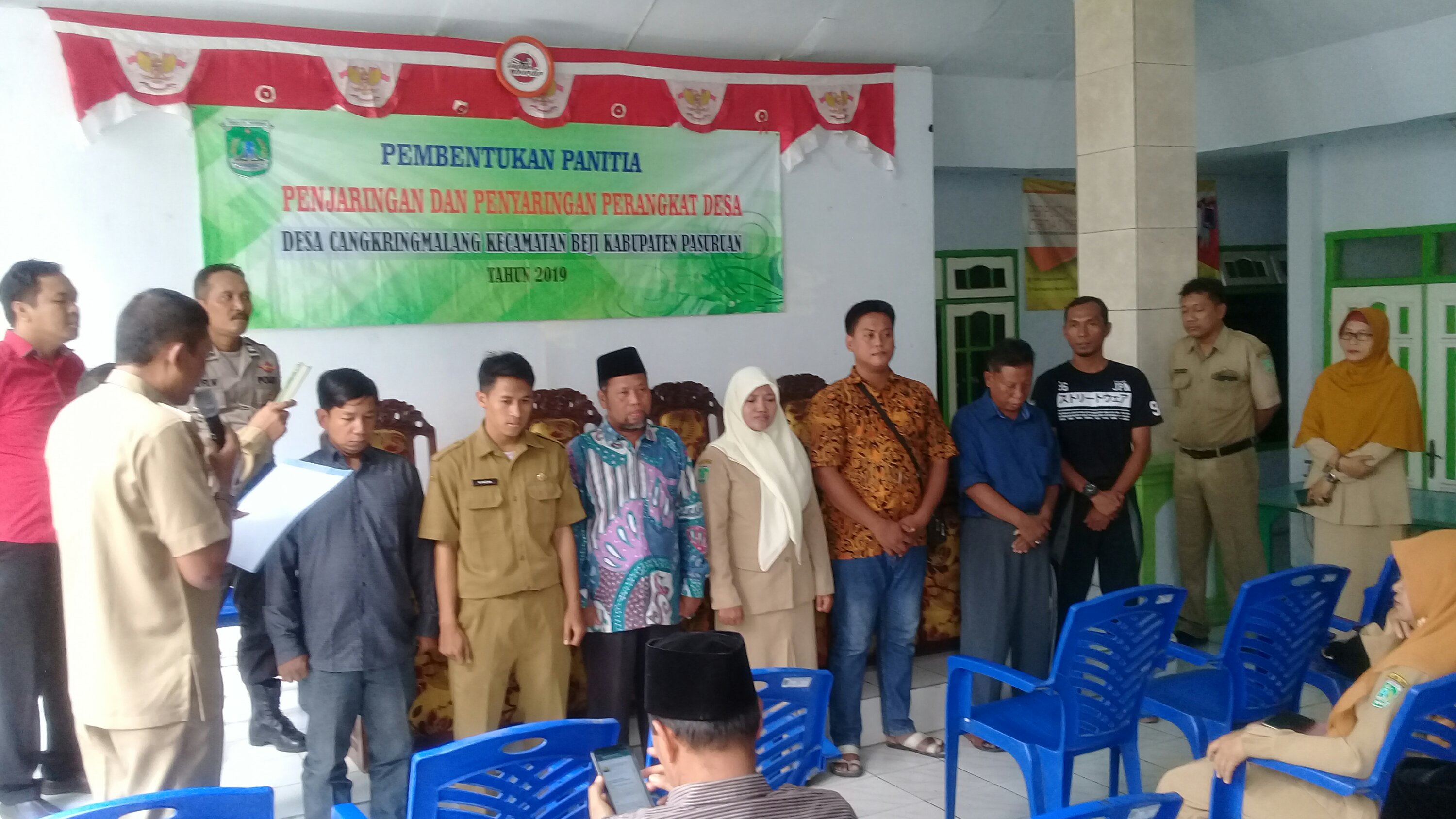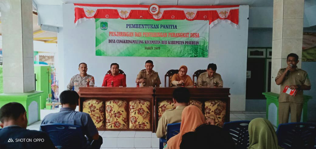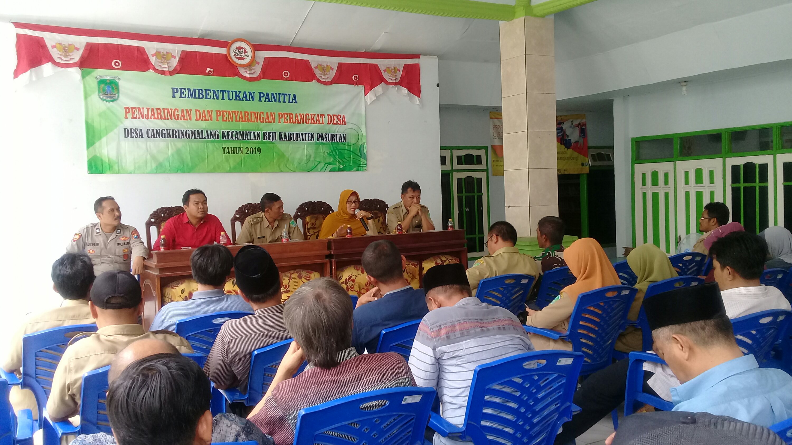 Beji (4/11) Pemerintah Desa Cangkringmalang Kecamatan Beji Kabupaten Pasuruan menyelenggarakan Pembentukan Panitia Penjaringan Perangkat Desa. Dalam sambutannya, Hufron Kepala Desa Cangringmalang berharap agar proses penjaringan perangkat desa ini berjalan secara transparan dan memunculkan calon-calon perangkat desa yang bermutu, guna mewujudkan Desa Cangkringmalang yang lebih baik lagi.