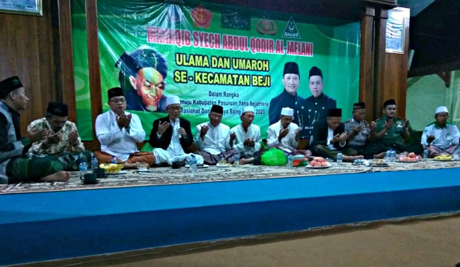 Beji (11/2) Pemerintah Kabupaten Pasuruan memiliki program yang bertujuan untuk mempererat hubungan baik antara Ulama dengan Umaro’ yang dikemas dalam bentuk kegiatan “manaqib” sekaligus doa bersama. Selasa tanggal 11 Februari 2020 digelar acara tersebut bertempat di Pendopo Kecamatan Beji. Ada yang spesial di acara ini, dimana acara manaqib bertepatan dengan ulang tahun Camat Beji yang ke-50 tahun.